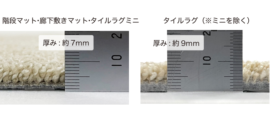 タイルラグは9mm厚で底つき感を少なく。(※ミニのみ7mm厚)